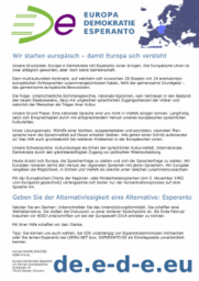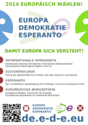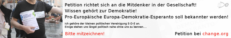 Im Jahr 2003 formierte sich von Frankreich ausgehend mit Europa – Demokratie – Esperanto eine europäische Bewegung, die die internationale Brückensprache Esperanto und die dahinter stehenden Ideen in die politische Diskussion einbringen möchte. EDE gibt es bereits in einer Reihe von europäischen Staaten oder befindet sich dort in der Gründung. Die deutsche Vereinigung Europa – Demokratie – Esperanto versteht sich als die deutsche Sektion des Dachverbandes der europäischen Föderation EDE mit Sitz in Straßburg (Frankreich). Mehr Informationen zur europäischen EDE-Föderation und den anderen Landesverbänden finden Sie unter: www.e-d-e.org (2009de.e-d-e.eu)